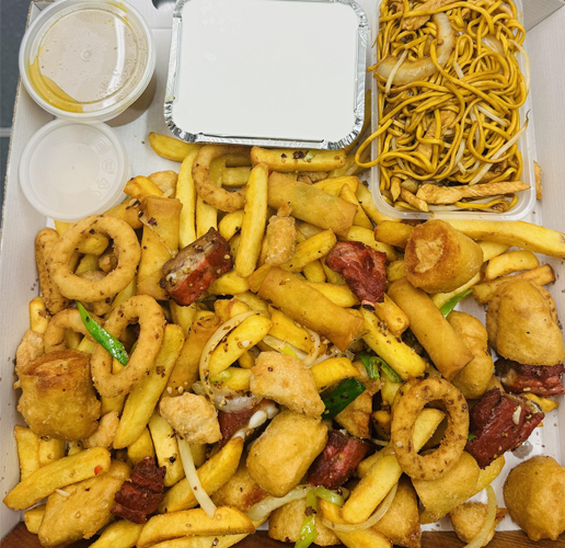 14inch salt & chilli box chicken chowmein fried rice chicken balls spare rips onion rings veggie spring rollp battered chichen pops chips 1x tub of selection sauce