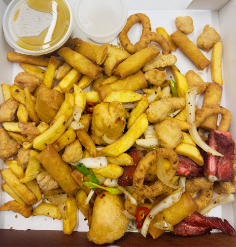14inch salt & chilli box chicken chowmein fried rice chicken balls spare rips onion rings veggie spring rollp battered chichen pops chips 1x tub of selection sauce